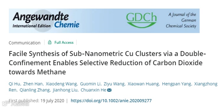 近日,深圳大学何传新教授课题组在国际顶级期刊Angew. Chem. Int. Ed. (影响因子:12.959) 上发表题为“Facile Synthesis of Sub-Nanometric Cu Clusters via a Double-Confinement Enables Selective Reduction of Carbon Dioxide towards Methane”的研究工作。