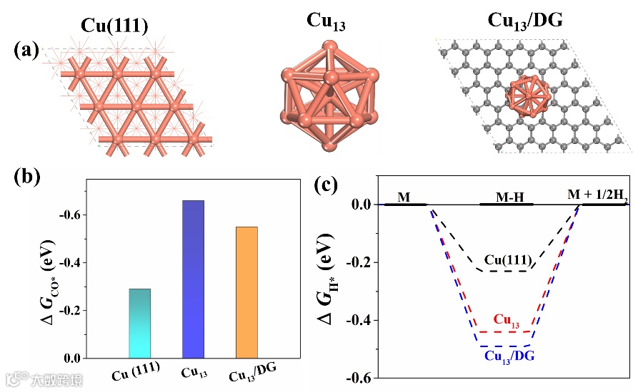 根据文献报道,与更大的铜纳米颗粒相比,铜簇铜簇的d带中心向上移动,可以增强中间体的吸附强度。对于Cu13团簇负载在缺陷石墨烯上的结构模型(Cu13/DG),Bader电荷分析显示铜的价电子为141.36 |e|,但是不含有缺陷石墨烯的Cu13团簇的价电子为143.00 |e|。这表明存在着电子从铜簇到缺陷石墨烯的转移,进一步证实了铜与缺陷碳之间存在着强烈的相互作用(SMSI)。