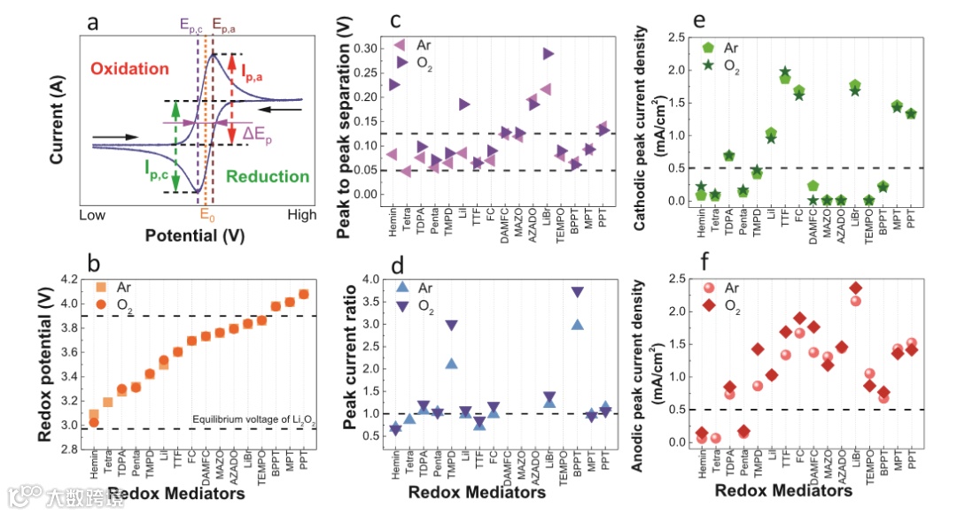 到目前为止,二甲基亚砜(DMSO)中的任一种或二甲基亚砜(DMSO)中的RMs,如四硫富瓦烯(TTF),碘化锂(LiI)中的I3-/I2或I-/I3-,三[4-(二乙氨基)苯基]胺(TDPA),2,2,6,6-四甲基哌啶氧基(TEMPO),铁(II)酞菁(FePc),2-氮杂烷-N-氧基(AZADO),和二茂铁(FC)四甘醇二甲醚(TEGDME)已被多个研究小组报道。然而,这些研究都没有系统地研究过RMs在特定锂氧电池系统中的性能。在这项研究中,从循环伏安法(CV)的角度,作者研究了DMSO和TEGDME电解质中有机金属、卤化物和有机基团的一系列RMs的电化学特性,如氧化还原电位,阴极和阳极峰的分离及其电流强度。这些测量的CV参数首先用于在所有研究的RMs中预先筛选“主要”RMs。然后,从循环伏安和电池循环实验中进一步研究所选的“初级”RMs的可逆性,随后进行密度泛函理论(DFT)计算,以深入了解其在锂氧电池中的稳定性。
