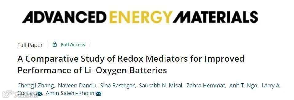 氧化还原介体(RMs)是一种可溶的催化剂,位于电解液中,可以提高锂氧电池的能量效率(降低过电位)和循环性。近日,美国伊利诺伊大学的Amin Salehi-Khojin教授和阿贡国家实验室Larry A. Curtiss教授等人在国际知名期刊Advanced Energy Materials上发表题为“A Comparative Study of Redox Mediators for Improved Performance of Li–Oxygen Batteries”的文章。本文第一作者是Chengji Zhang。本文采用循环伏安法(CV)研究了二甲基亚砜和四乙二醇二甲醚电解质在Li-O2体系中的20 RMs,测定了它们的氧化还原电位、正极和负极峰的分离以及电流强度等电化学特性。根据它们的电化学性能,选择6个RMs作为“主要”选择,然后进行稳定性试验,以检查它们在连续循环后的电化学响应。此外,恒流循环试验是在一个锂-氧电池系统内进行的,该系统装配有选定的六个有效值,用于实际情况的一致性调查。结果表明,卤化物和有机金属均方根的恒电流-恒电流循环试验结果是一致的,前者表现出更高的稳定性。然而,有机均方根在循环伏安中表现出较高的可逆性,而在电池循环结果中表现出较低的可逆性。为了进一步了解RMs的稳定性和氧化还原电位,进行了密度泛函理论计算。本研究为选择最可靠的锂-氧电池RMs值提供了比较信息,同时对其电化学活性和稳定性有了新的基本认识。