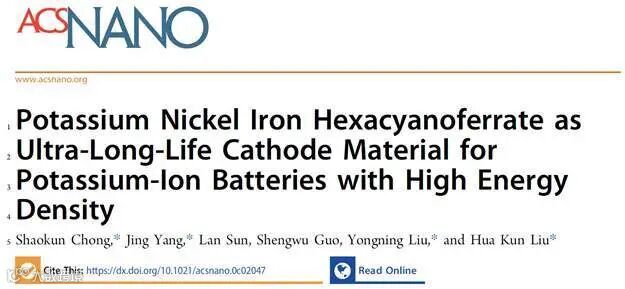 近日,西北工业大学崇少坤副教授/西安交通大学柳永宁教授/麻省理工学院杨静博士/卧龙岗大学刘华坤院士联合在国际顶级期刊ACS Nano (影响因子:14.588) 上发表题为“Potassium Nickel Iron Hexacyanoferrate as Ultra-Long-Life Cathode Material for Potassium-Ion Batteries with High Energy Density”的研究工作。
