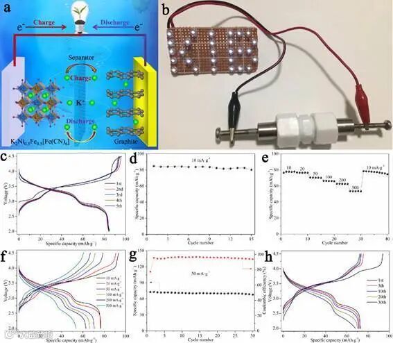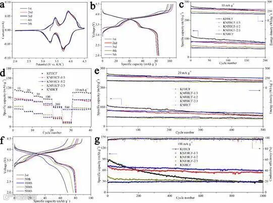 研究人员成功地组装了基于KNFHCF-1/2正极和石墨负极的钾离子全电池,在10 mA·g-1下首次可逆容量为84.9 mAh·g-1,工作电压为3.33 V,具有优异的循环性能和倍率性能。