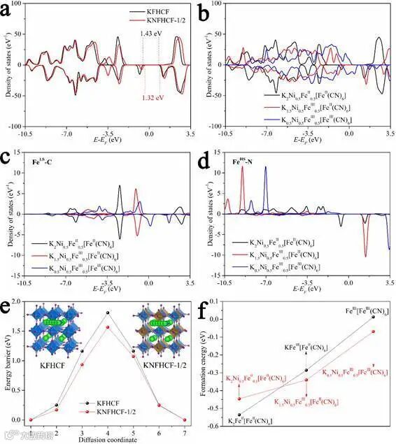 (a)KFHCF与KNFHCF-1/2的态密度.(b)KNFHCF-1/2在不同充电状态下的态密度.(c-d)KNFHCF-1/2中FeLS-C与FeHS-N的局部态密度.(e)两种材料的钾离子扩散路径与势垒.(f)钾离子脱出过程中电极材料的形成能。