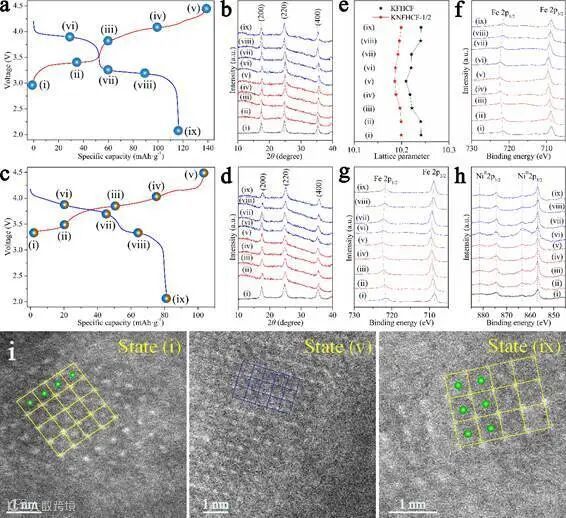 (i)KNFHCF-1/2在循环前,完全充满电与放完电状态下的HAADF-STEM图片。