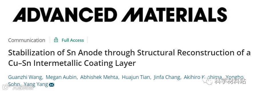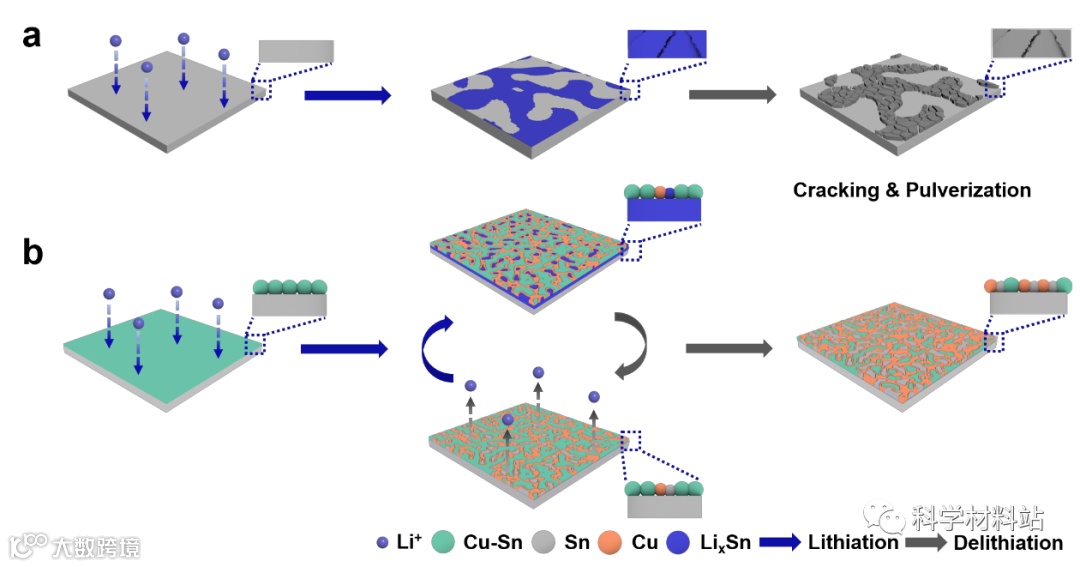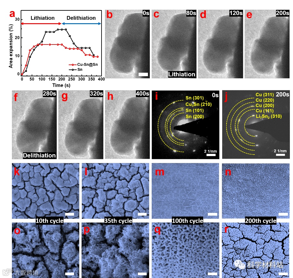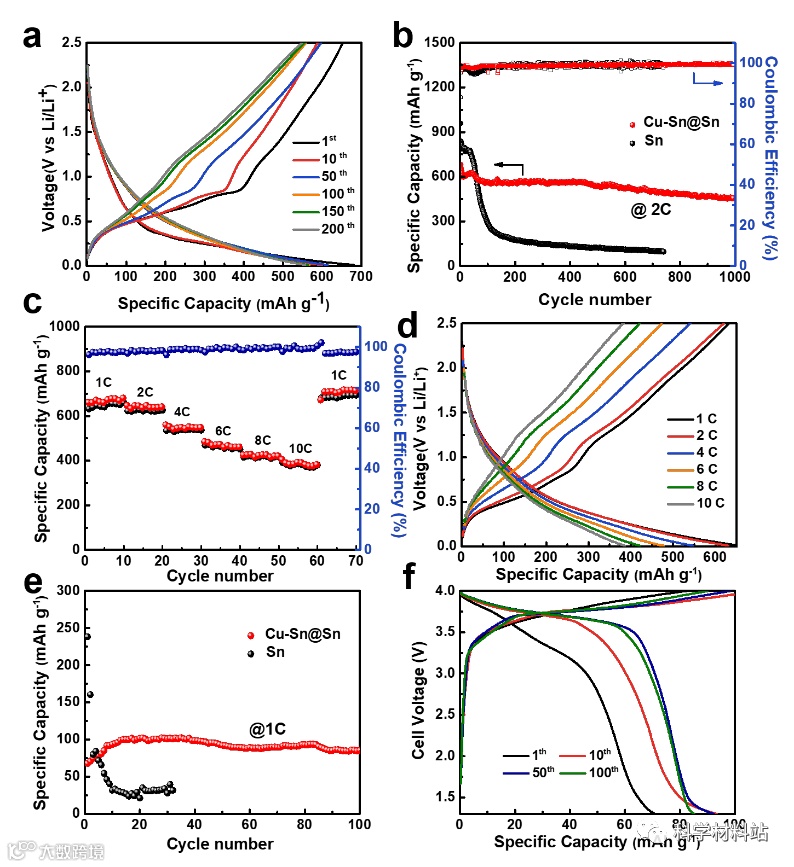 图3e,f中为Cu-Sn@Sn的GITT以及计算所得的Li+扩散系数, Cu-Sn@Sn具有与Sn相似的Li+扩散系数,再次证明Cu-Sn锂化反应的低活性没有阻塞Li+的扩散。另外,Cu-Sn@Sn的Li+扩散系数在锂化/去锂化过程中相较Sn更加的稳定,证明借助Cu-Sn 涂层改善了材料的结构完整性,有助于Li+的扩散。
