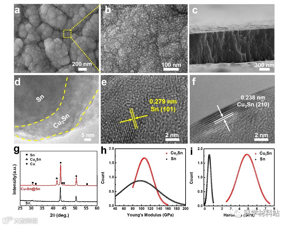 图2. Cu-Sn@Sn电极的表面形貌,结构以及机械性能表征。