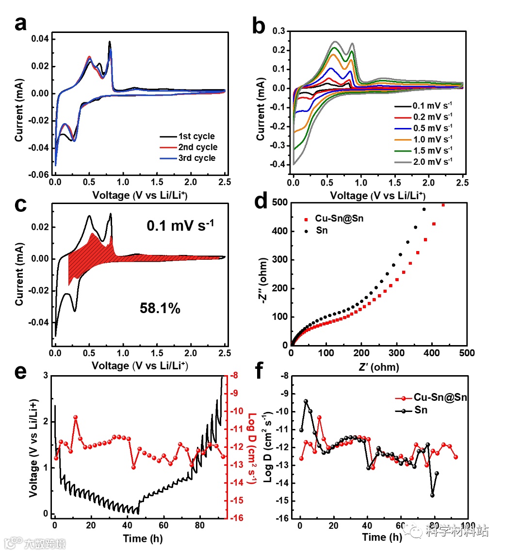 由图3b在不同扫速下得到的CV曲线,计算得到在0.1 mV s-1 扫描速率下,Cu-Sn@Sn的电容行为对总体能量存储的贡献为58.1%(图3c),与金属Sn电极的结果接近(55.1%),这证明Cu-Sn涂层不但没有阻塞Li+的扩散路径,反而促进了电极材料的电化学反应动力学。