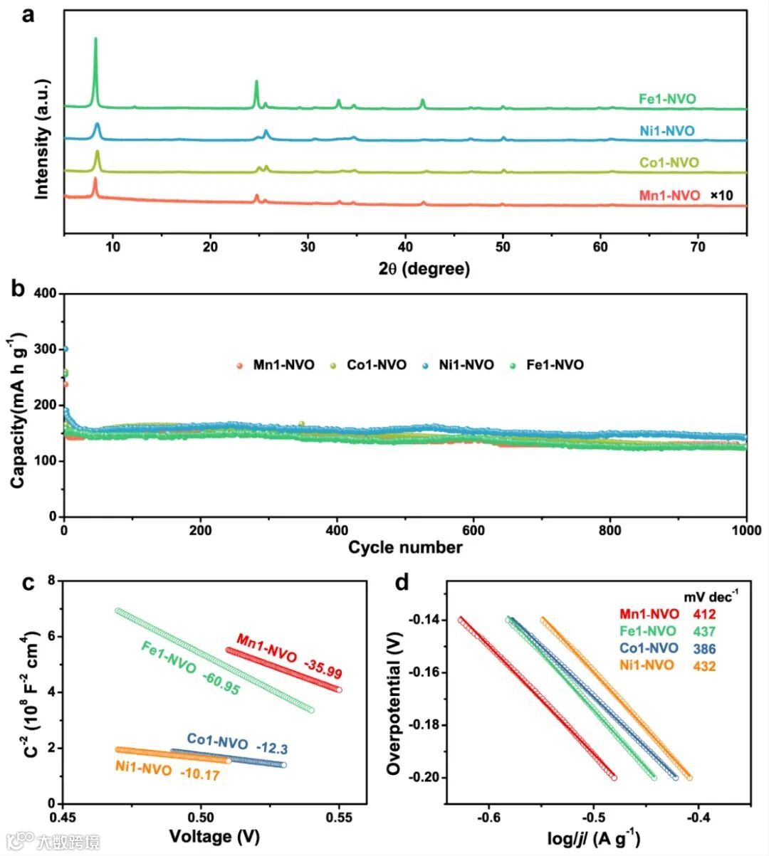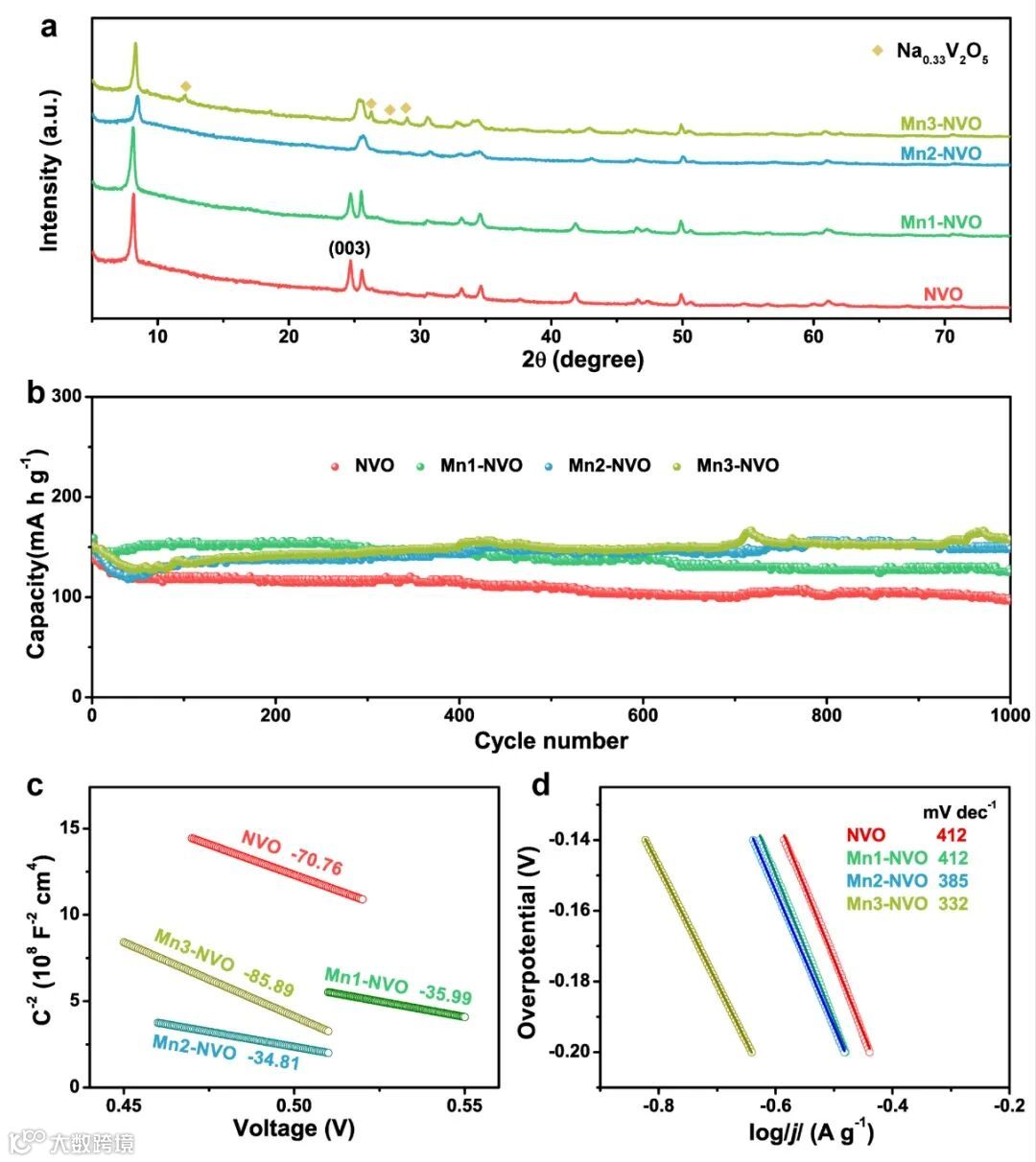 图6. a)Mn1-NVO, Mn2-NVO, Mn3-NVO和NVO的XRD对比图;b)不同锰含量的NVO正极材料在4A g-1下的循环性能对比;c)Mott-Schottky曲线;d)Tafel曲线。