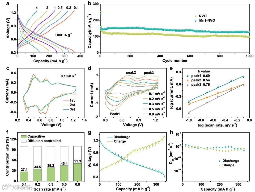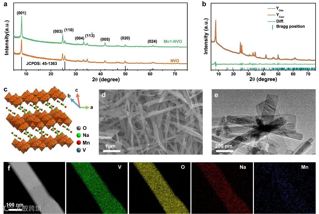 为了探讨锰离子的作用,作者制备了(Na,Fe)V8O20·nH2O, (Na,Co)V8O20·nH2O, (Na,Ni)V8O20·nH2O, (Na,Ca)V8O20·nH2O, (Na,K)V8O20 ·nH2O 正极材料,分别标记为Fe1-NVO, Co1-NVO, Ni1-NVO, Ca1-NVO, K1-NVO。通过XRD表征发现,这些金属离子的预嵌入,未显著改变NVO的结构(图5a)。