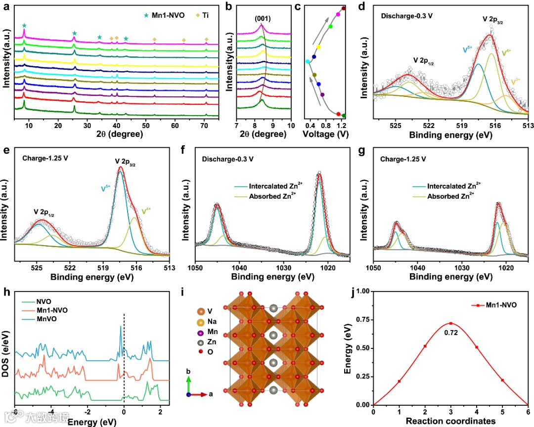 图3. 充放电过程结构变化及理论计算研究。a-c)首圈充放电过程中的离位XRD结果;d)首圈完全放电态下V的XPS分析;e)首圈完全充电态下V的XPS分析;f)首圈完全放电态下Zn的XPS分析;g)首圈完全充电态下Zn的XPS分析;h)电子态密度计算结果;i)锌离子在Mn1-NVO中的可能扩散路径;j)锌离子在Mn1-NVO中的扩散能垒。