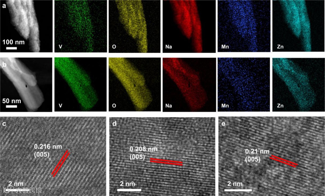 图4. a)首圈完全放电态Mn1-NVO的TEM及元素分布图;b)首圈完全充电态Mn1-NVO的TEM及元素分布图;c-e)Mn1-NVO在初始态、完全放电态、完全充电态的高分辨图。