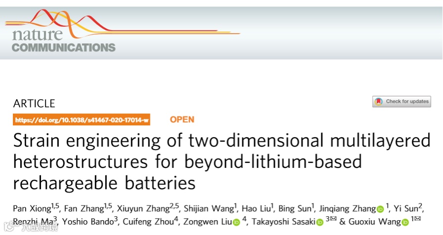 悉尼科技大学汪国秀教授联合日本国立材料科学研究所高義佐佐木(Takayoshi Sasaki)教授等人在国际知名期刊Nature Communicaions上发表”Strain engineering of two-dimensional multilayered heterostructures for beyond-lithium-based rechargeable batteries”一文。熊攀,张凡,张秀云为本文的共同第一作者。