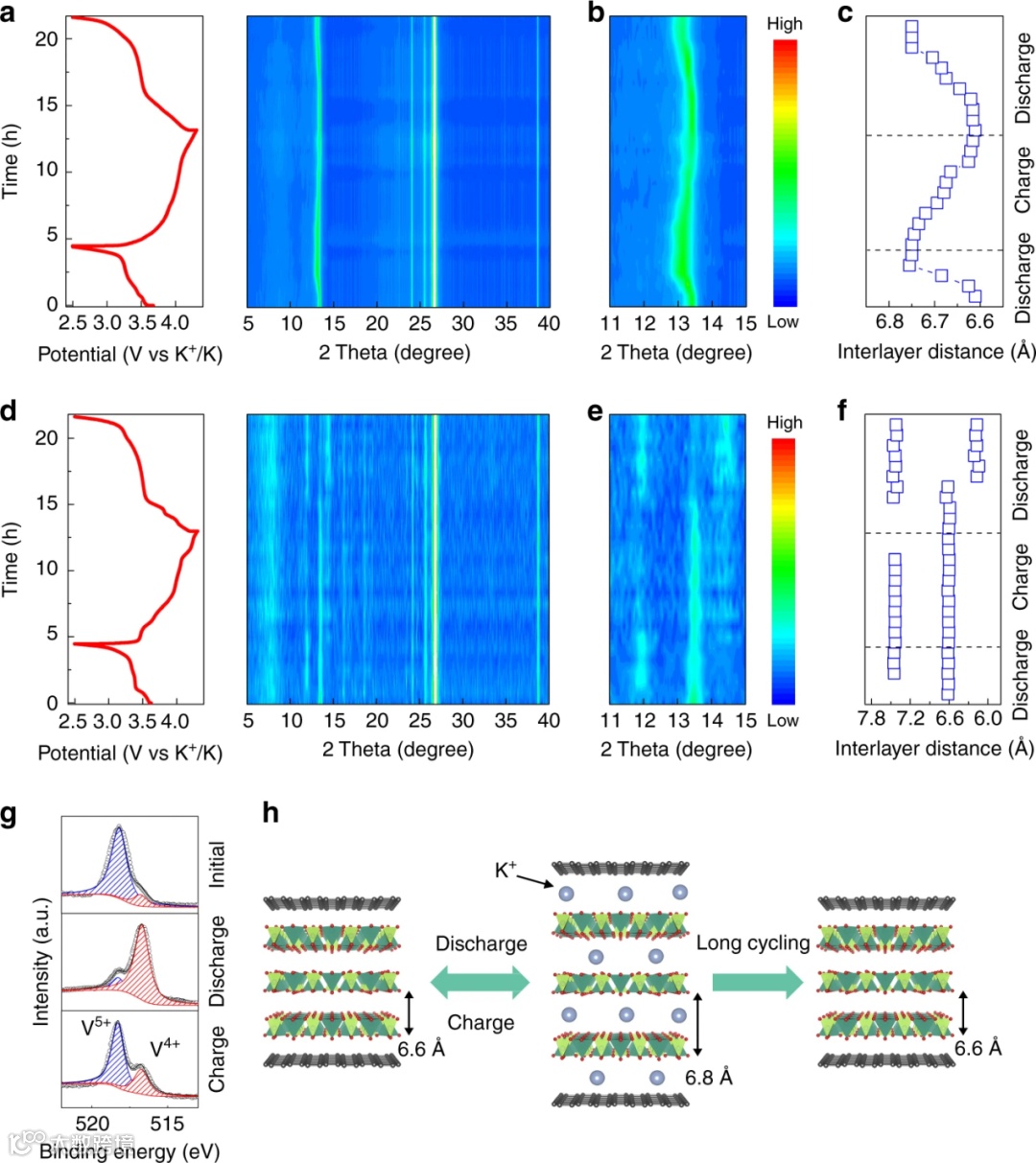 该工作报道了一种新型的可应用于超锂基电池的零应变正极材料。由于大的离子半径所带来的体积膨胀等影响,纯的VOPO4纳米片在嵌入脱出K离子之后,结构迅速坍塌,循环稳定不佳。这与大部分报道的结果类似。然而将VOPO4纳米片与石墨烯组装成二维异质结后,循环稳定性得到大大提升。
