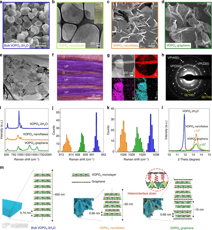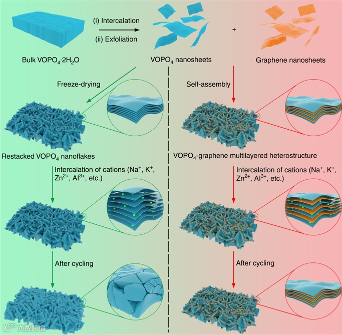 该实验中材料合成具有一定难度,如何获得稳定高质量的VOPO4纳米片以及VOPO4与石墨烯纳米片的有序堆叠是该实验的关键。在报道的工作中,往往采用直接溶剂超声剥离块状前驱体的方法来获得VOPO4纳米片。然而,采用该方法获得的纳米片厚度不均匀,产量低。