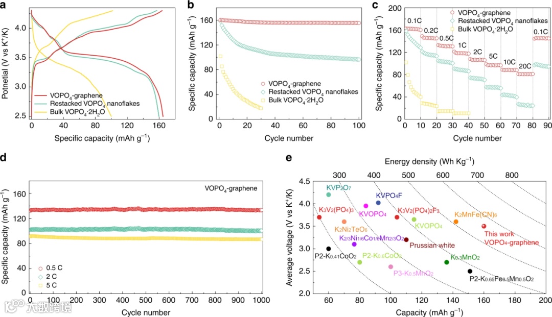 采用该二维多层异质结构作为正极,实现了稳定的可逆容量为160 mA h g-1、高能量密度为约570 W h kg-1的高性能K+离子电池。 -