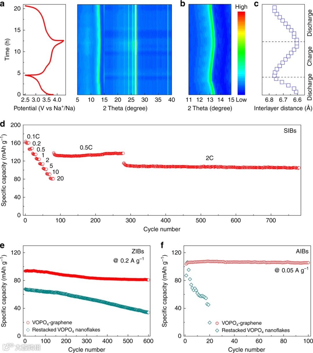 原位研究结果表明,Na/K离子在二维异质结构的层间进行可逆的嵌入脱出反应,且整个过程所产生的体积膨胀可以忽略不记(小于2%)。进一步将这种二维异质结构运用到锌和铝离子电池中,也表现出比纯VOPO4纳米片优异的循环稳定性。这种具有零应变、可适用于不同金属离子可逆插层反应的正极材料鲜有报道。