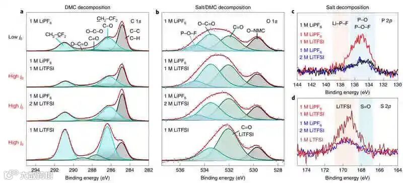 总之,作者使用两种最常用的盐LiPF6和LiTFSI对电解质在正极-液体电解质界面上的锂迁移进行了系统的研究,揭示了交换电流在含有TFSI−阴离子基团的电解液中,密度比仅含有PF6−的电解液高出约100倍。当两个阴离子基团都存在时,从而竞争溶解Li+离子,TFSI−基团比PF6−更容易与Li+结合,从而提供更容易的解溶和更快的界面动力学。这些研究为电解质在高电流倍率下实现更好的性能提供了一种研究思路。