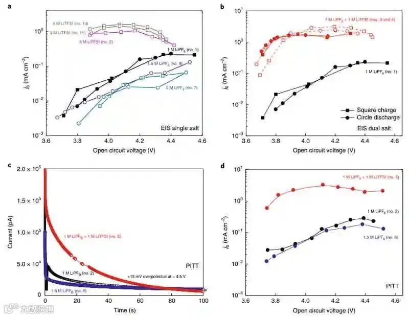 这里首次给出了J0与SOC、盐种类和总盐浓度三个自变量的依赖关系。在含有1M LiPF6的参考电解质中(图a,c),用EIS和PITT测得的两个粒子显示了SOC依赖关系。J0随充电电压增加约100倍,在高压(~4.5 V)下接近~0.2 mA cm−2,且在充放电之间基本可逆。