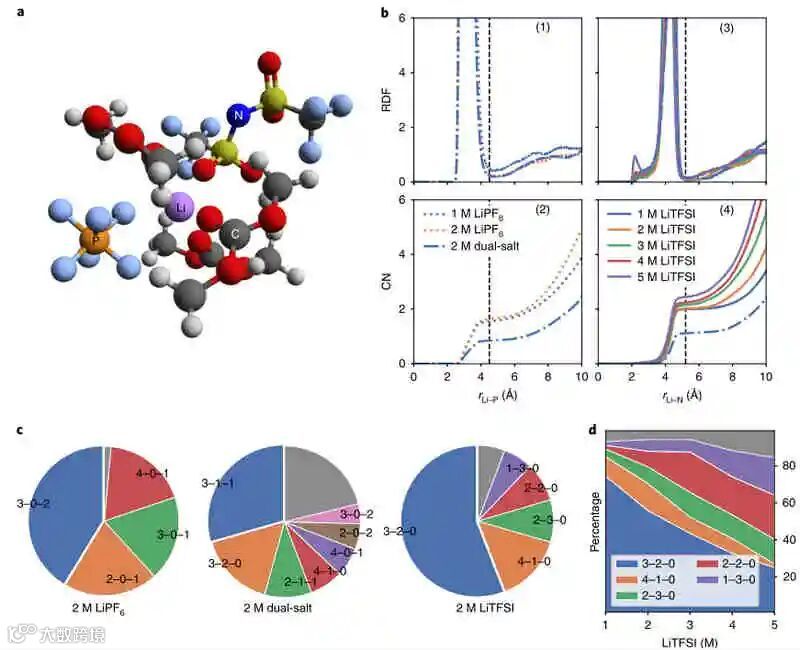 锂溶剂化结构(如图a所示)的配位数(CN)是通过对第一个峰上的径向分布函数(RDF)(图b)积分来确定的。随着浓度的增加,P或N的CN增加,因为在高浓度电解质中有更多的阴离子与锂离子配位。这表明在溶剂化过程中至少有一个阴离子配位了一个锂离子。对于相同摩尔分数的单一盐(LiPF6或LiTFSI),每个锂周围的TFSi-高于PF6−。这结果表明TFSI−有更强的配位锂离子的倾向。
