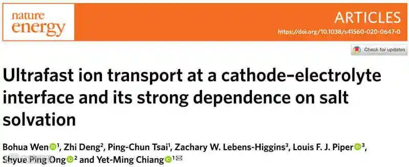 Ultrafast ion transport at a cathode–electrolyte interface and its strong dependence on salt solvation. (Nature Energy, 2020, DOI: 10.1038/ s41560-020-0647-0)