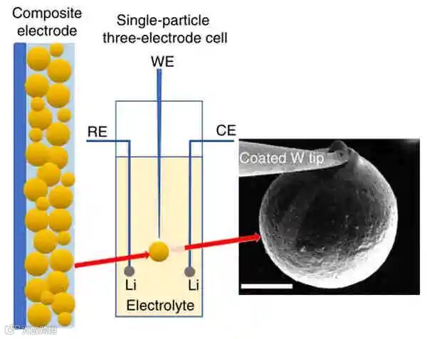 作者从通常用于复合电极的商用NMC粉末中分离出单电极颗粒,并在三电极池中进行测量。插图中显示了安装在钨探针上的28 μm粒子的扫描电子显微镜图像。作者的目的是揭示电解质组成和SOC对J0的影响,这将为如何设计快速界面动力学系统提供新见解。