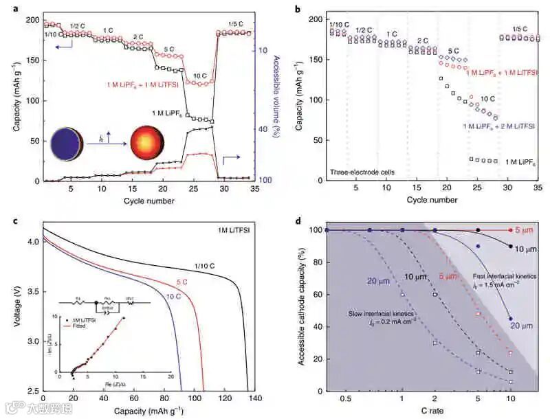 如果对单粒子结果的解释是正确的,那么观察到的动力学差异也应该可以转化为使用宏观电极的电池。在纽扣电池中,用NMC333复合正极和锂金属对电极电池测试了三种电解质。在双盐情况下,由于LiPF6提供的钝化作用,1和2 M LiTFSI浓度与铝集流体保持稳定。然而,在5 C和10 C的倍率下,观察到放电容量差异较大。