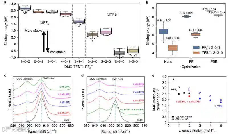 用极化连续介质模型(PCM)计算的2 M单盐电解质(图a)的结合能与MD模拟中观察到的结果一致,即单盐LiPF6和LiTFSI电解质中最常见的3-2-0和3-0-2组态具有最高的结合能。
