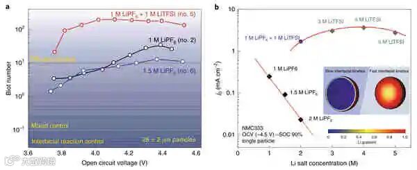 对PITT数据进行了分析以评估界面电阻和体积电阻对NMC333中锂迁移的相对贡献。在相同锂盐浓度下,TFSI-作为阴离子基团时的界面反应速率比PF6−至少高一个数量级。TFSI−电解液的界面反应速率在1~5 M浓度之间几乎没有浓度依赖性,而PF6−结果随着浓度的增加而急剧下降。