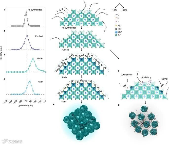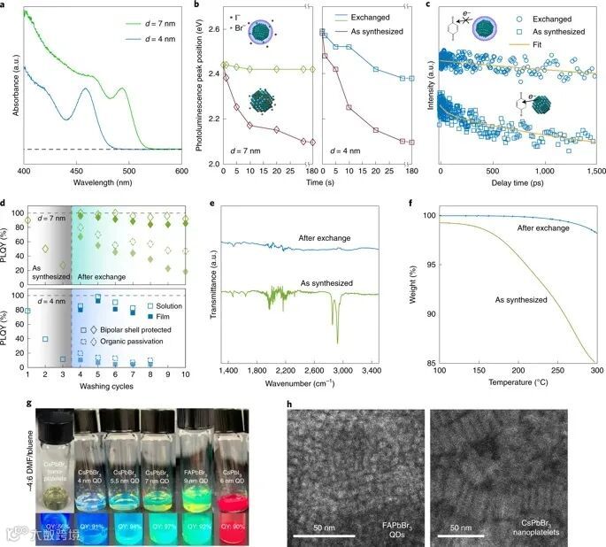 作者采用双极壳表面置换方法,借助原子配体以静电方式稳定钙钛矿型量子点。根据先前报道的方法,合成了具有强量子限域的单分散CsPbBr3钙钛矿量子点。