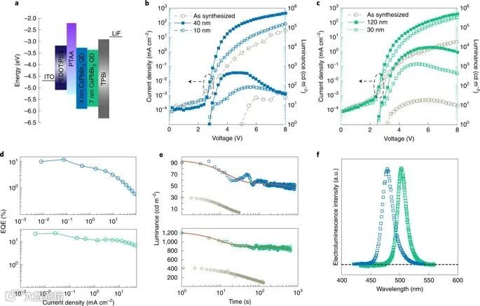总之,该研究采用了基于溶液的配体交换来稳定具有双极壳的钙钛矿QD胶体。QD墨水产生了紧密堆积的QD固态膜,具有近乎统一的PLQY和高载流子迁移率。另外,使用不同尺寸的QD制造了高效的LED,绿色和蓝色LED均显示出增强的工作稳定性。这项工作进一步证实,经过适当处理的钙钛矿纳米晶体有望应用于下一代LED。