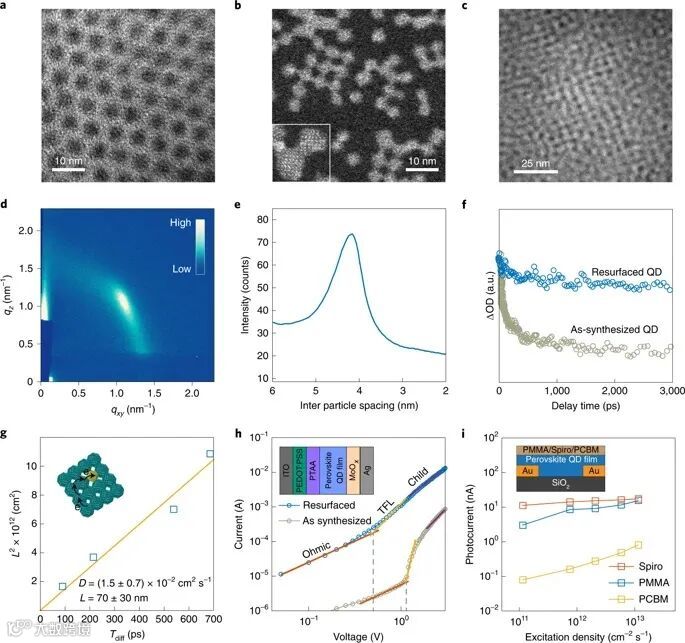 旋转浇铸的QD薄膜TEM图像显示了QD的自组装(图3b,c)。TEM中的QD间距离(〜4.2 nm,图3b)比具有常规有机配体的QD距离(6-7 nm)小(图3a)。掠入射小角X射线散射(GISAXS)衍射图(图3d)表明了单分散QD的取向顺序。衍射图样的方位积分显示出一个尖峰,其QD间距离为4.2 nm(图3e)。如图3f所示,表面置换QD薄膜的恢复时间为4 ns;激子扩散长度为〜70 ±30 nm(图3g),使用Mott-Gurney方法得到了µe=0.02 cm2 V−1 s−1 和µh=0.01 cm2 V−1 s−1,这些值高于先前报道的钙钛矿QD膜和相似带隙的2D钙钛矿薄膜(图3h)。