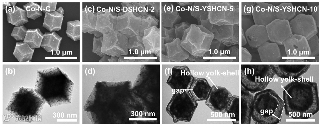 该工作首先通过三聚硫氰酸(TCA)与ZIF-67的相互作用制备核壳结构的ZIF-67@Co-TCA-x,并改变TCA与ZIF-67的质量比(x)来有效调控核壳结构颗粒的形貌。随后,高温热解ZIF-67@Co-TCA-x制备Co/N/S共掺杂的双壳中空碳纳米材料Co-N/S-DSHCN-x (图1所示)。