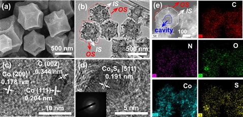 图4说明了电催化剂Co-N/S-DSHCN-3.5是Co/N/S共掺杂的双壳型中空碳材料。Co-N/S-DSHCN-3.5的高分辨率TEM中,Co纳米颗粒被石墨层包封。Co9S8存在与外壳层中,选区域电子衍射和拉曼光谱证实了Co9S8的存在。元素mapping表明Co-N/S-DSHCN-3.5中C、N、O、Co和S元素的均匀分布。