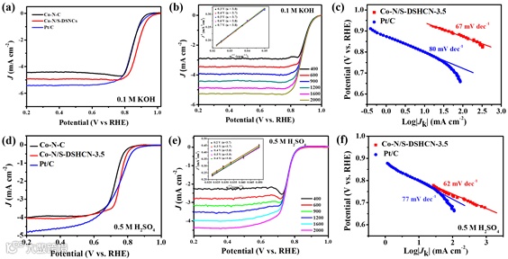 在酸碱性介质中,氧还原反应都按照近四电子机理进行。与Pt/C相比,较低的Tafel斜率表明Co-N/S-DSHCN-3.5具有更快的电子转移速率。此外,Co-N/S-DSHCN-3.5的稳定性和抗甲醇性能也明显优于商业Pt/C催化剂。