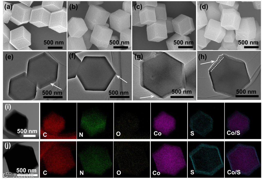 图2说明了改变TCA与ZIF-67的质量比(x)可以有效调控核壳前驱体的壳层厚度。即随着TCA用量的增加,前驱体ZIF-67@Co-TCA-x的壳层厚度逐渐变厚。元素mapping证实Co2+离子和TCA通过强配位相互作用形成Co-TCA壳,在ZIF-67@Co-TCA-10中含S元素壳层变厚,这表明Co-TCA外壳的厚度随TCA的增加而增加。