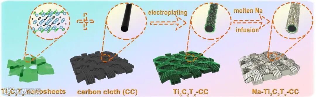 图1. Ti3C2Tx-CC骨架和Na-Ti3C2Tx-CC复合金属负极的制备工艺示意图