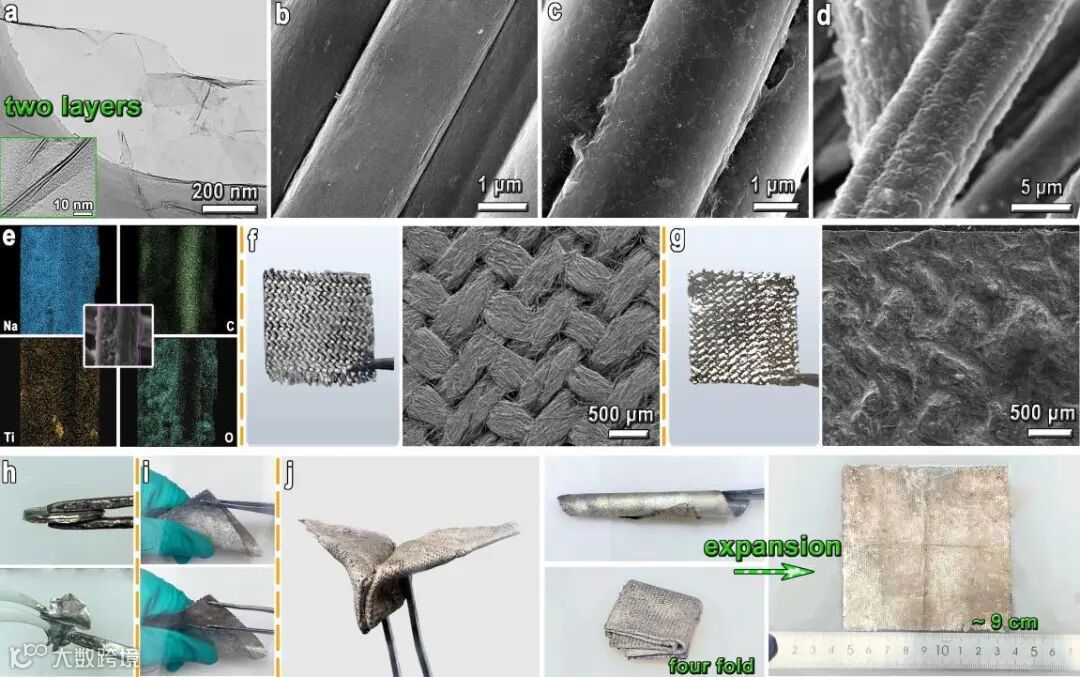 (a)Ti3C2Tx纳米片的TEM图像;(b-d)CC、Ti3C2Tx-CC和Na-Ti3C2Tx-CC的SEM图像;(e)Na-Ti3C2Tx的EDS图谱分析;(f,g)具有半负载和满载的Na-Ti3C2Tx-CC的数码照片和SEM图像;(h,i)裸Na箔和Na-Ti3C2Tx-CC的粘性对比;(j)可折叠和可弯曲的Na-Ti3C2Tx-CC 复合电极。