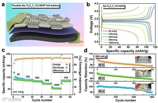 图5. 柔性Na-Ti3C2Tx-CC NVP电池的电化学性能。