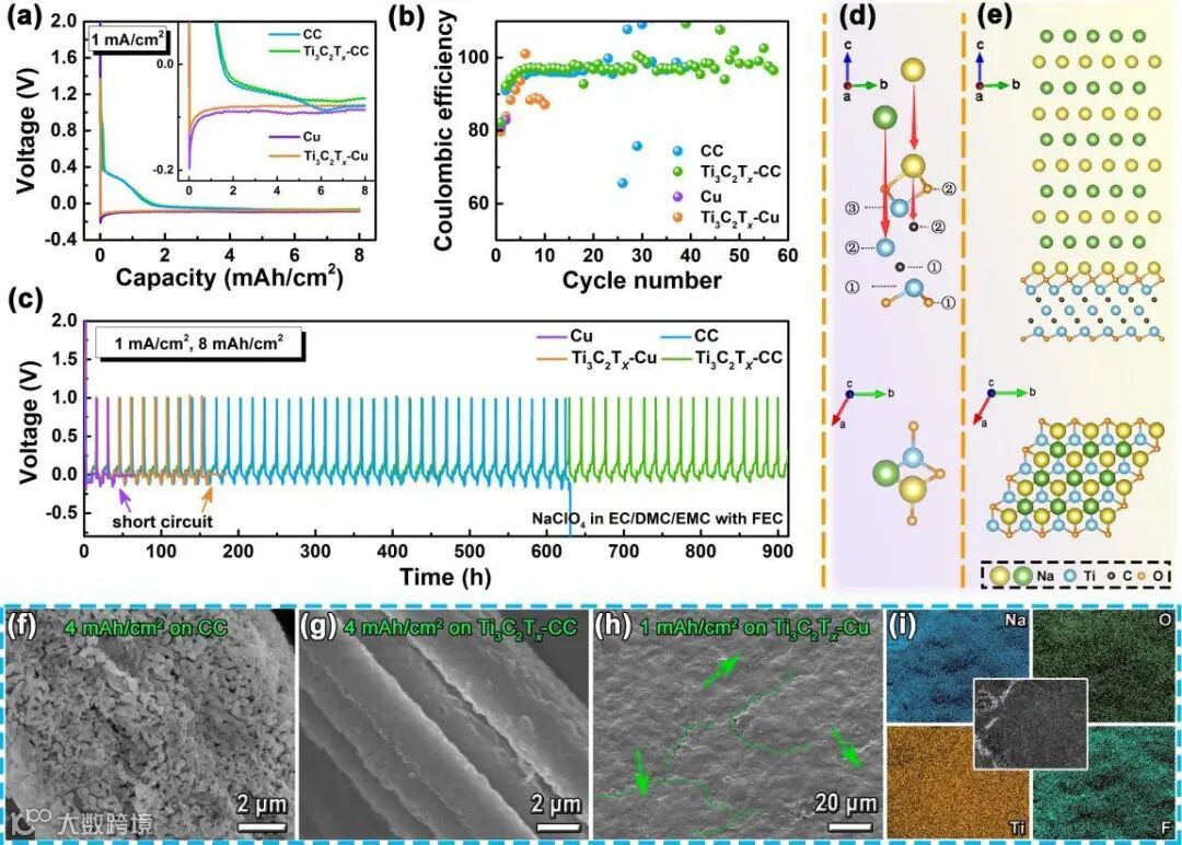 (a-c)Na在不同宿主结构上的首圈电压曲线,库伦效率和循环稳定性对比;(d,e)相应的模拟计算;(f-h)分别在不同宿主结构上的Na沉积形貌图;(i)Na沉积量为1 mAh cm-2的Na-Ti3C2Tx-Cu-EDS能谱分析。