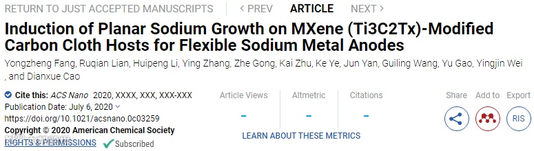 近日,哈尔滨工程大学曹殿学教授和朱凯老师(共同通讯作者)在国际顶级期刊ACS Nano (影响因子:14.588) 上发表题为“Induction of Planar Sodium Growth on MXene (Ti3C2Tx)-Modified Carbon Cloth Hosts for Flexible Sodium Metal Anodes”的研究工作。