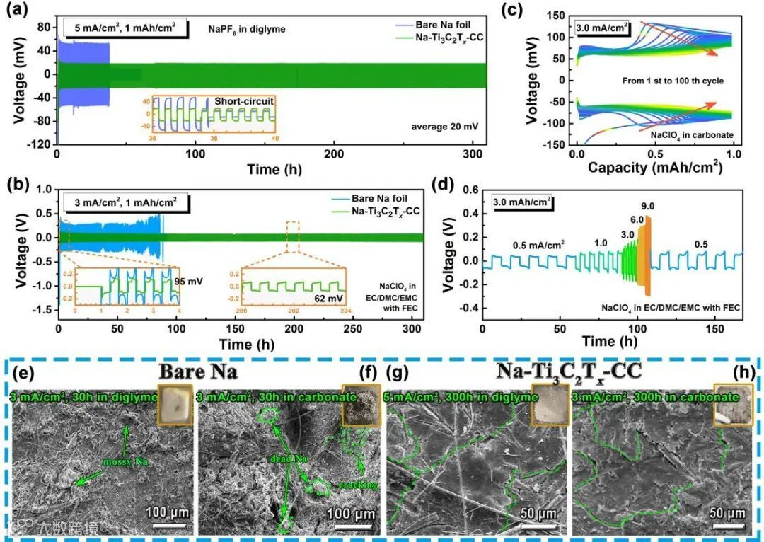 (a)在1 M NaPF6二甘醇二甲醚电解质中:裸Na(蓝色)和Na-Ti3C2Tx-CC(绿色)循环稳定性的比较;(b) 在含5.0% FEC的1.0 M NaClO4 EC/DMC/EMC电解质中,裸Na(蓝色)和Na-Ti3C2Tx-CC(绿色)循环稳定性的比较;(c)Na-Ti3C2Tx-CC从1到100次循环的电压;(d)不同倍率下的长循环电压曲线;(e-h)不同电解液中电极循环后的形貌。