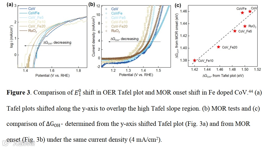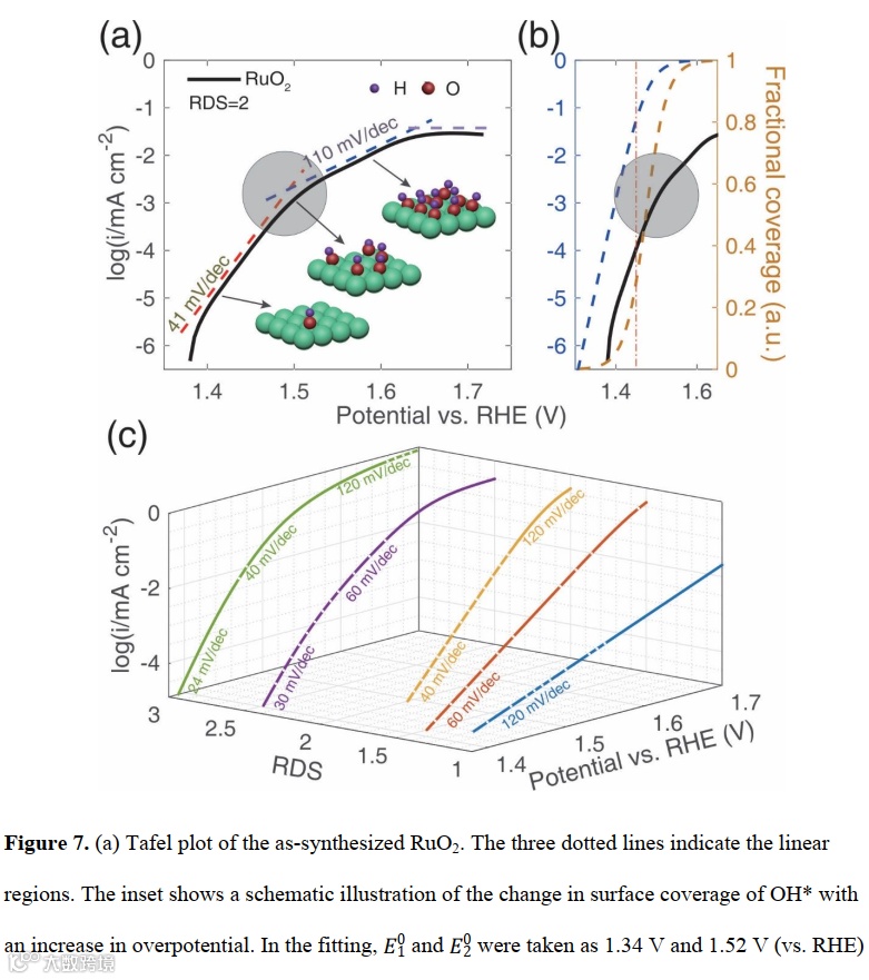 以第二步控速的RuO2为例,在低电位区间会出现40 mV/dec左右的低Tafel斜率段,在高电位区间出现120 mV/dec左右的高Tafel斜率段,这个变化的根本原因是中间体的饱和过程。在低电位的时候,OH*中间体的覆盖度很低,导致材料电化学电流的变化由浓度(中间体覆盖度)以及反应常数(k)两个因素同时影响,中间体覆盖度随着电位的指数增长降低了Tafel斜率。