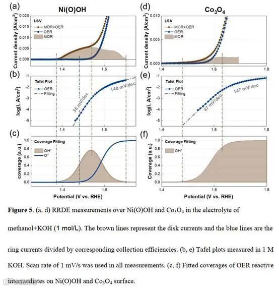 由此我们就可以结合盘环的分析,将盘电极上的醇氧化反应抽离开来。阴影区域显示了总电流和OER电流的区别,即AOR电流。他的起峰位,峰形,顶点都和我们的热动力学模型计算得到的OH*中间体的覆盖度随着电位变化趋势基本吻合,有力地说明了醇氧化探针反应和热动力学模型在探测中间体吸附能上的优势。而下图中两个材料不一样的醇氧化电流趋势以及OH*变化趋势,则说明了不一样的控速步。具体分析可见原文。