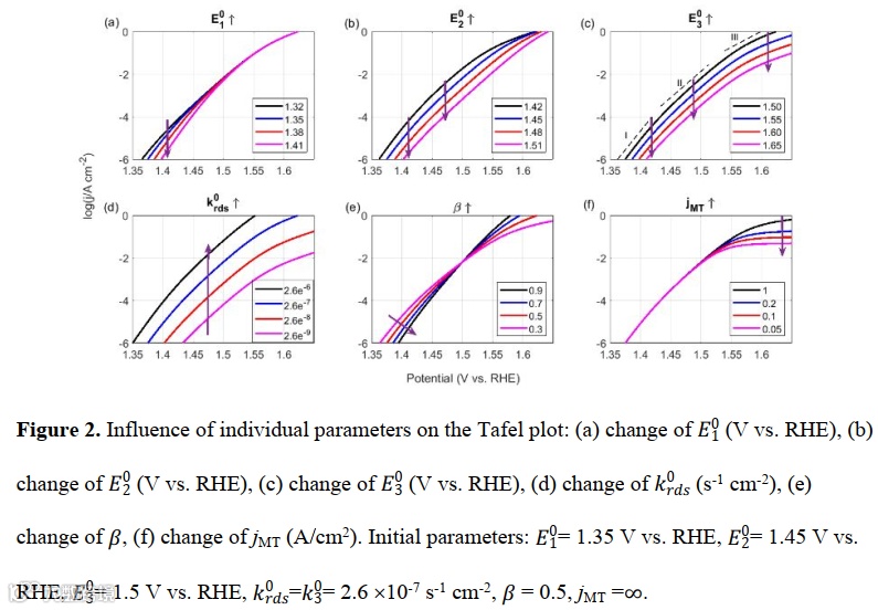 从下图可以看出,调整模型的不同参数会得到有规律的电化学性能变化趋势。以一个第三步控速的催化剂为例,改变第一部基元反应的平衡电位(正比于OH*中间体吸附能),材料的Tafel曲线只有最低电位区间的Tafel线性区域会受到影响(关于多个线性区域的来源,详细的分析可见最后一节动力学分析),而类似的,改变第二、三步平衡电位,会同时影响到前两、三段Tafel线性区域的位置。具体的数学分析可以参见原文。