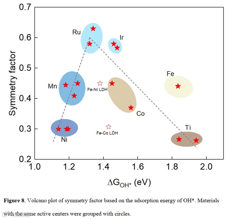 在模型拟合的结果中,我们发现了对称因子(symmetry factor,β),在基元反应中也称传输系数(transfer coefficient, α)与中间体吸附能的火山图关系。
