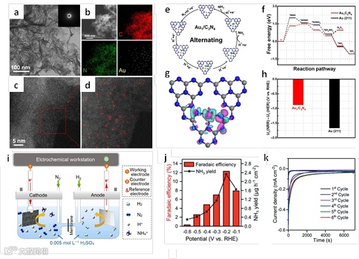 铁(Fe)、铜(Cu)、钨(W)、钼(Mo)、钌(Ru)、金(Au)基SACs可以电催化还原N2来合成氨。在这些SACs的催化作用下,NRR呈现出了理想的NH3产率、法拉第效率和稳定性。