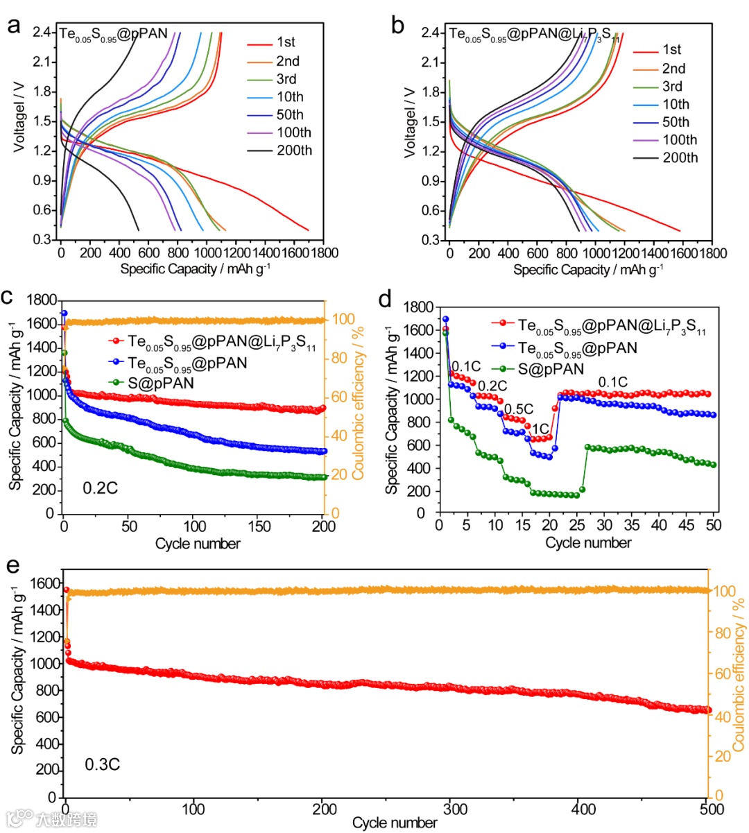 (a)Bare Te0.05S0.95@pPAN复合材料在不同循环次数下的充放电曲线图;(b)Te0.05S0.95@pPAN@Li7P3S11复合材料在不同循环次数下的充放电曲线图;(c)Te0.05S0.95@pPAN电解质包覆前后的循环性能图,电流密度为0.2C;(d)Te0.05S0.95@pPAN电解质包覆前后的倍率性能图;(e)Te0.05S0.95@pPAN@Li7P3S11的长循环性能图,电流密度为0.3C。