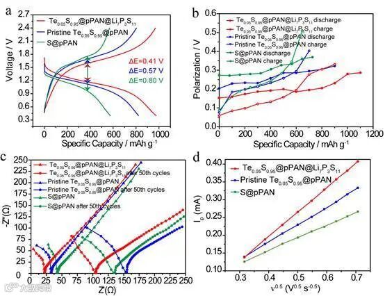 此外,Te0.05S0.95@pPAN@Li7P3S11显示出更高的容量和最小极化(图5(b))。通过比较三种材料的阻抗和锂离子扩散能力,Te掺杂和Li7P3S11包覆后的Te0.05S0.95@pPAN@Li7P3S11具有最小的阻抗和最优异的锂离子扩散能力(图5(c-d))。