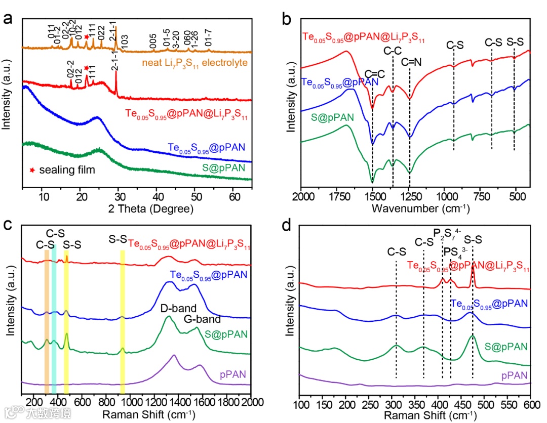 图2为Te0.05S0.95@pPAN电解质包覆前后的结构表征图。XRD和FT-IR从光谱的角度证明了包覆层Li7P3S11的存在。