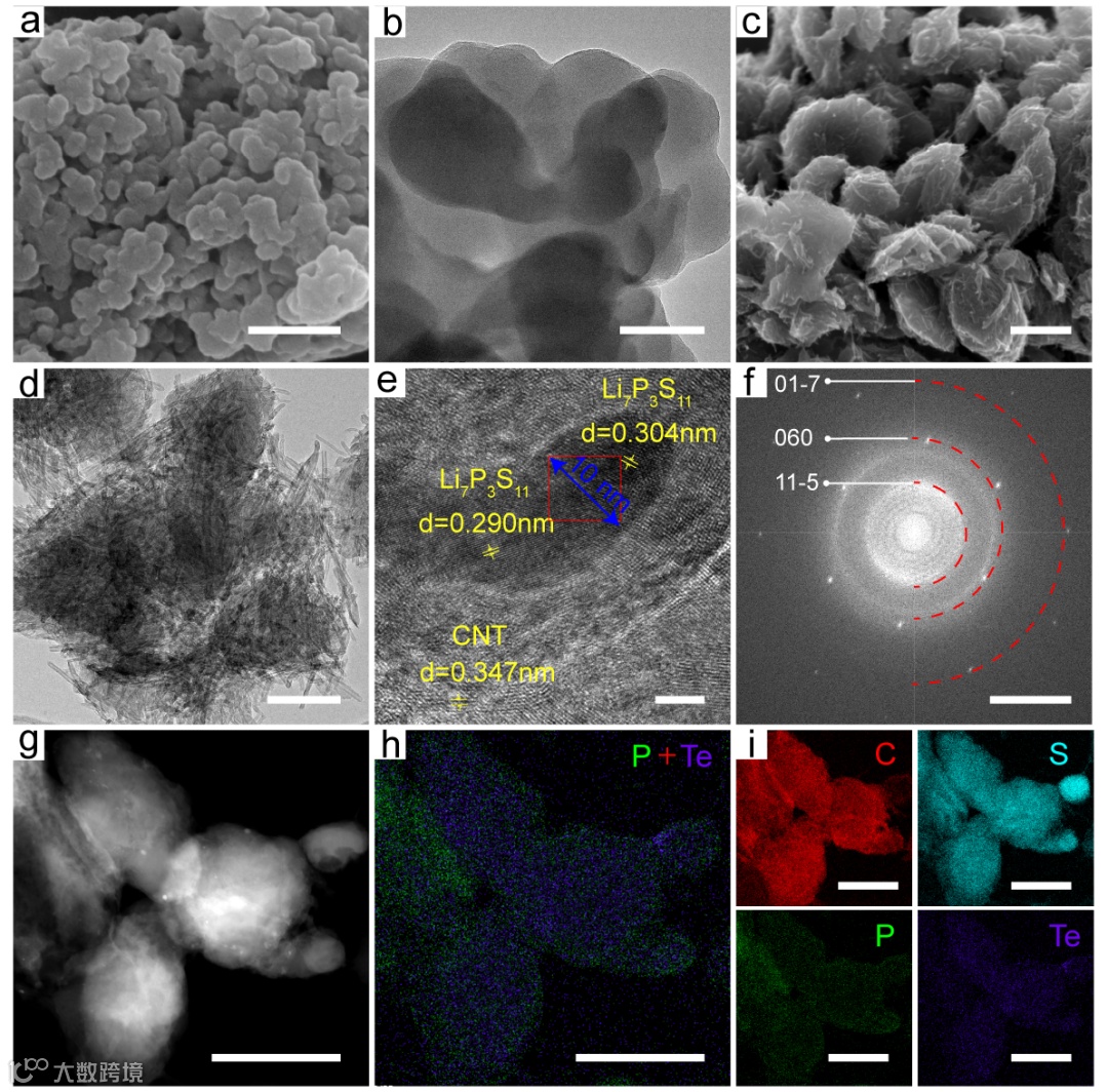 (a)Te0.05S0.95@pPAN的SEM图;(b)Te0.05S0.95@pPAN的TEM图;(c)Te0.05S0.95@pPAN@Li7P3S11的SEM图;(d)Te0.05S0.95@pPAN@Li7P3S11的TEM图;(e)Te0.05S0.95@pPAN@Li7P3S11的高分辨HR-TEM图;(f)Te0.05S0.95@pPAN@Li7P3S11的选区电子衍射图;(g-i)Te0.05S0.95@pPAN@Li7P3S11的TEM EDS mapping图。